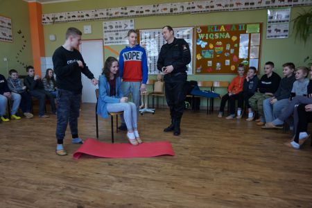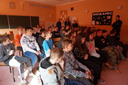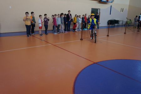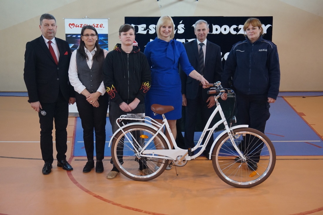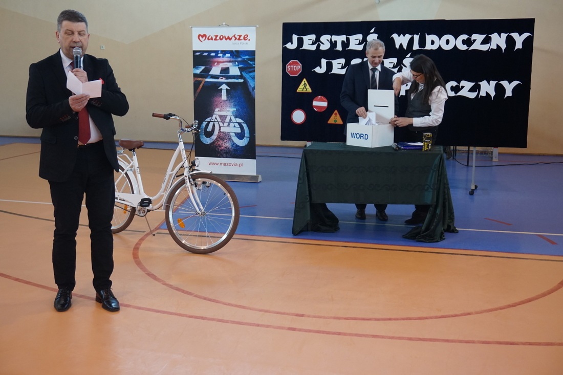 Podczas spotkania nie zabrakło konkursu, w którym główną nagrodą był rower. Dzieci, wypełniając krótki test o zasadach ruchu drogowego, wzięły udział w losowaniu. Rower wygrał uczeń klasy siódmej Kamil Mariański.